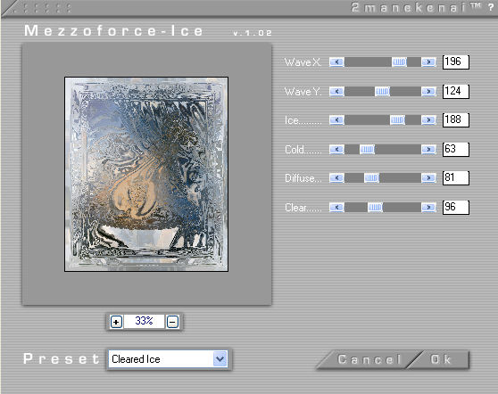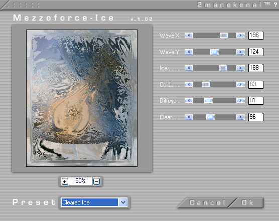 13. Wiederhole nun die Schritte 3 - 5. 14. Bild - Rand hinzufügen - 15 Pixel in weiß und markiert diesen Rand mit dem Zauberstab. Wendet den Filter 2manekena - MezzoForce-Ice mit folgenden Einstellungen an: