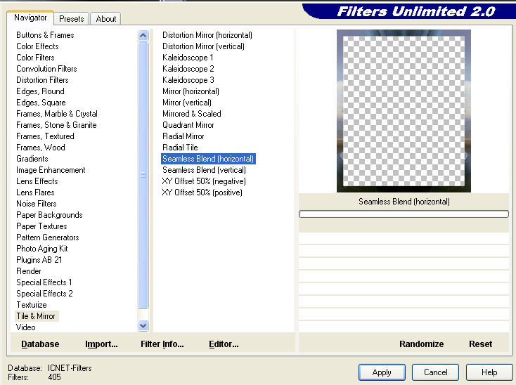 Hebt die Auswahl auf. 10. Wendet die Schritte 3-5 noch einmal an. Stellt dazu Eure Vorder- und Hintergrundfarbe auch wieder um auf die Farben, die Ihr in Punkt 2 verwendet habt. 11. Bild - Rand hinzufügen - 25 Pixel in weiß. Markiert diesen Rand mit dem Zauberstab. Legt eine neue Rasterebene an, kopiert Euch Euer Ausgangsbild und fügt es in eine Auswahl ein. Hebt die Auswahl auf und spiegelt diese Ebene Vertikal. 12. Wendet den Filter Filters Unlimited 2 - Tile & Mirror - Seamless Blend (horizontal) an: