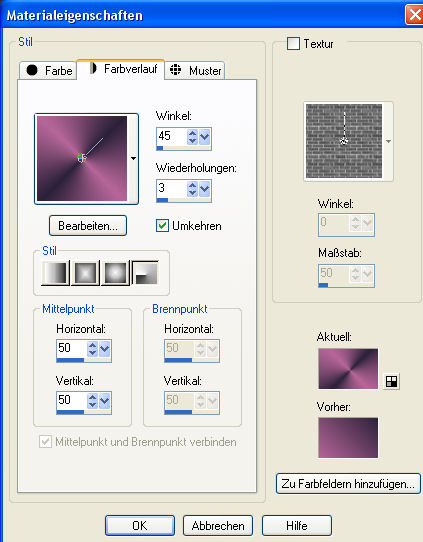 Dieses Tutorial habe ich selbst entworfen und es unterliegt meinem Copyright. Das Material stammt aus Tauschgruppen und das Copyright liegt beim entsprechenden Künstler. Ich habe das Tutorial mit Paint Shop Pro X2 geschrieben, es läßt sich aber mit allen anderen PSP-Versionen problemlos nachbasteln. Du benötigst: Paint Shop Pro Tuben: 1 Sternen- oder Planetentube 1 Blumentube 1 Personentube 1 Hintergrundbild Mein Material könnt Ihr Euch hier herunterladen. Filter: Filter Factory Gallery D - Wam Jets Hinweis: Ich habe den Filter im Filters Unlimited 2.0 integriert. Das müßt Ihr aber nicht.... er läuft auch ohne den Unlimited. Hast Du alles zusammen? Dann lass uns beginnen! 1. Öffne Dir ein neues transparentes Arbeitsblatt in 700 x 600 Pixeln Größe. 2. Suche Dir aus Deinen Tuben eine helle Vordergrundfarbe (meine ist #b66699) und eine dunkle Hintergrundfarbe (meine ist #2b213a). Erstelle Dir aus diesen Farben einen Farbverlauf. Ich habe mich für diesen entschieden: