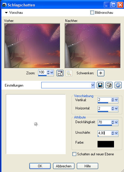 Anpassen - Bildschärfe verringern - Gaußscher Weichzeichner - gebt dort 35 als Wert ein. 3. Legt eine neue Rastereben an. Auswahl - Alles auswählen Kopiert das Tube "M.Sandritter_08_T_M_274.pspimage" oder Eure eigene Sternen- oder Planetentube und fügt sie auf Eurem Bild in eine Auswahl ein. Hebt die Auswahl auf. 4. Kopiert das Tube "beauty_blood.pspimage" oder Eure eigene Personentube und fügt sie auf Eurem Bild als neue Ebene ein. Verschiebt sie an einen Platz der Euch gefällt. 5. Kopiert das Tube "M.Sandritter_08_T_M_273_imag_c_by_Victoria_Kunznetsova.pspimage" oder Eure eigene Blumentube und fügt sie auf Eurem Bild als neue Ebene ein. Wenn Ihr die beigelegte Blumentube verwendet, dann sollte Ihr sie auf 70% verkleinern. Bild - Größe ändern - 70% (Größe aller Ebenen anpassen nicht angehakt). Verschiebt das Tube nach unten rechts. 6. Stellt Eure Vordergrundfarbe wieder um auf Farbe und klickt einmal in das Farbfeld hinein. Notiert Euch nun den F-Wert (Farbe) und den S-Wert (Sättigung). Geht auf Anpassen - Farbton und Sättigung - Kolorieren und gebt dort diesen F-Wert und den S-Wert an. Nun passt auch die Farbe Eurer Blume zu Eurem Bild. 7. Legt eine neue Rasterebene an. Auswahl - Alles auswählen Füllt die Auswahl mit Eurer Hintergrundfarbe. Dazu muß der Auswahlmodus Eurer Farbeimers auf "Deckende Bereiche" stehen. Auswahl - Ändern - Verkleinern - um 3 Pixel und drückt einmal die Entf-Taste auf Eurer Tastatur. Hebe die Auswahl auf. 8. Fasse alle Ebenen sichtbar zusammen. Dupliziere die Ebene. 9. Bleibe auf der duplizierten Ebene und gehe auf Bild - Größe ändern - auf 85% Effekte - 3D-Effekte - Schlagschatten mit dieser Einstellung: