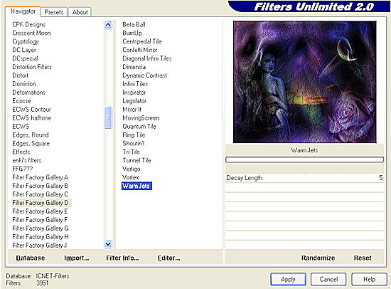 Wende den gleichen Schlagschatten noch einmal an mit Minuswerten bei Vertikal und Horizontal. 10. Aktiviere Deine untere Ebene. Lege eine neue Rasterebene an. Auswahl - Alles auswählen. 11. Kopiere das Hintergrundbild "JHanna-38 background.jpg" oder Dein eigenes Hintergrundbild und füge es in eine Auswahl ein. Hebe die Auswahl auf. Ebenen - Einbinden - Nach unten zusammenfassen. 12. Bleibe auf der unteren Ebene und wende den Filter Factory Gallery D - Wam Jets mit diesen Einstellungen an: