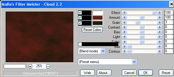 Dieses Tutorial habe ich selbst entworfen und es unterliegt meinem Copyright. Das Material stammt aus Tauschgruppen und das Copyright liegt beim jeweiligen Künstler. Ich habe das Tutorial mit Paint Shop Pro X2 geschrieben, es läßt sich aber mit allen anderen PSP-Versionen problemlos nachbasteln. Du benötigst: Paint Shop Pro Animationsshop Tuben: 1 Tunneltube 1 Frauentube 1 Pflanzen- oder Blumentube Mein Material kannst Du Dir hier herunterladen. Filter: Mura´s Meister - Cloud Graphics Plus - Cross Shadow Eye Candy 4000 - Corona Hast Du alles zusammen? Dann lass uns beginnen! 1. Öffne Dir ein neues transparentes Arbeitsblatt in 700 x 550 Pixeln Größe. 2. Suche Dir aus Deinen Tuben eine nicht zu helle Vordergrundfarbe (meine ist #601f17) und eine dunkle Hintergrundfarbe (meine ist #221a0b). Fülle Dein Blatt mit der Vordergrundfarbe. 3. Wende den Filter Mura´s Meister - Cloud mit diesen Einstellungen an: