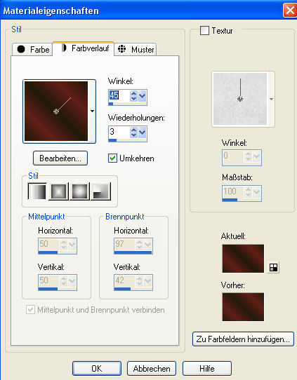 4. Kopiere das Tube "fire_water.pspimage" oder Deine eigene Tunneltube und füge sie als neue Ebene auf Deinem Bild ein. Passe sie gegebenenfalls größenmäßig an (Größe aller Ebenen anpassen nicht angehakt). 5. Kopiere das Tube "GOTHIC LADY MDZ MIST.pspimage" oder Deine eigene Frauentube und füge sie auf Deinem Bild als neue Ebene ein. Passe sie größenmäßig an. Ich habe die Frauentube auf 60% verkleinert (Größe aller Ebenen anpassen nicht angehakt). Verschiebe sie nach rects an den Rand. 6. Kopiere das Tube "mds5273Pilze23.06.07pspimage.pspimage" oder Deine eigene Blumen- oder Pflanzentube und füge sie als neue Ebene auf Deinem Bild ein. Passe sie gegebenenfalls größenmäßig an (Größe aller Ebenen anpassen nicht angehakt). 7. Lege eine neue Rastereben an. Auswahl - Alles auswählen Erstelle aus Deiner Vorder- und Hintergrundfarbe einen schönen Farbverlauf. Ich habe diesen gewählt: