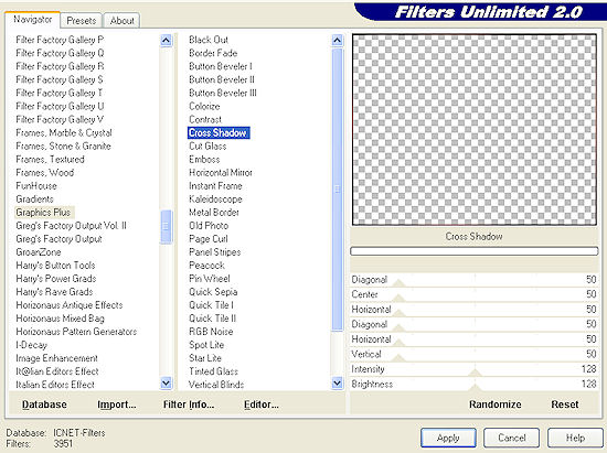und fülle Deine Auswahl damit. Auswahl - Ändern - Verkleinern - um 5 Pixel Drücke einmal die Entf-Taste auf Deiner Tastatur. Auswahl - Umkehren Wende den Filter Graphics Plus - Cross Shadow mit den Standardeinstellungen an: