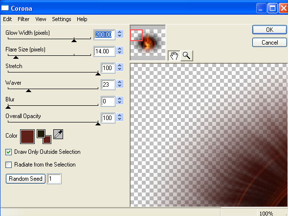 Hebe die Auswahl auf. 8. Beschrifte Dein Bild auf oberster Ebene und vergiß auch Deinen Namenszug oder Dein Wasserzeichen nicht. 9. Aktiviere nun Deine Tunnelebene und dupliziere sie zweimal. Benenne die unterste Tunnelebene um in Tunnel1. Die mittlere Tunneleben benenne um in Tunnel2. Die oberste Tunneleben benenne um in Tunnel3. Aktiviere die Ebene Tunnel1und wende den Filter Eye Candy 4000 - Corona mit diesen Einstellungen an: