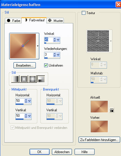 Dieses Tutorial habe ich selbst entworfen und es unterliegt meinem Copyright. Das Material stammt aus Tauschgruppen und das Copyright liegt beim jeweiligen Künstler. Ich habe das Tutorial mit Paint Shop Pro X2 geschrieben, es lässt sich aber auch mit allen anderen PSP-Versionen problemlos nachbasteln. Du benötigst: Paint Shop Pro Animationsshop Tuben: 1 Hintergrundbild 1 Planetentube oder Weltkugel 1 Future-Personentube Mein Material kannst Du Dir hier herunterladen. Filter: Graphics Plus - Cross Shadow Hast Du alles zusammen? Dann lass uns beginnen! 1. Öffne Dir ein neues transparentes Arbeitsblatt in 600 x 450 Pixeln Größe. 2. Suche Dir aus Deinen Tuben eine helle Vordergrundfarbe (meine ist #e1b584) und eine dunklere Hintergrundfarbe (meine ist #a15b42) und erstelle Dir aus diesen Farben einen schönen Farbverlauf. Ich habe diesen gewählt: