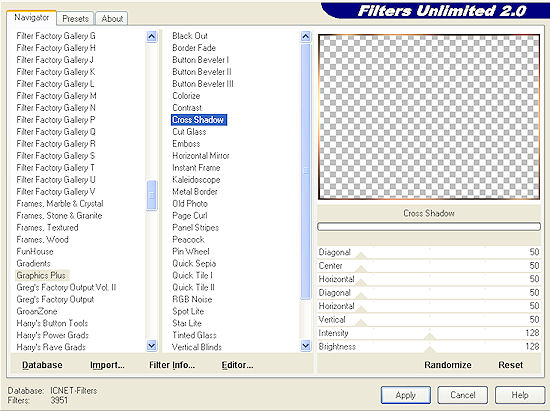 Fülle Dein Blatt mit dem Farbverlauf. 3. Kopiere den Hintergrund "JHanna_53 bground.jpg" oder Dein eigenes Hintergrundbild. Lege eine neue Rasterebene an Auswahl - Alles auswählen und füge Dein Hintergrundbild in eine Auswahl ein. Hebe die Auswahl auf und stelle den Mischmodus im Ebenenmanager auf "Hartes Licht". 4. Kopiere das Tube "AH_Universum_2306_08.pspimage" oder Deine eigene Planetentube und füge sie auf Deinem Bild als neue Ebene ein. Evtl. mußt Du die Größe anpassen (Größe aller Ebenen anpassen nicht angehakt)... ich habe meine Tube auf 90% verkleinert. Verschiebe das Tube mittig an den rechten Rand. 5. Kopiere nun das Tube "sorayama-tube_SIL&TAN.pspimage" oder Deine eigene Future-Personentube und füge sie auf Deinem Bild als neue Ebene ein. Passe sie größenmäßig an (Größe aller Ebenen anpassen nicht angehakt)... ich habe meine Tube auf 70% verkleinert. Verschiebe sie nach links an den Rand. 6. Lege eine neue Rasterebene an, Auswahl - Alles auswählen Fülle die Auswahl mit Deinem Farbverlauf. Auswahl - Ändern - Verkleinern - um 5 Pixel und drücke einmal die Entf-Taste auf Deiner Tastatur. 7. Auswahl - Umkehren Wende den Filter Graphics Plus - Cross Shadow mit diesen Einstellungen an: