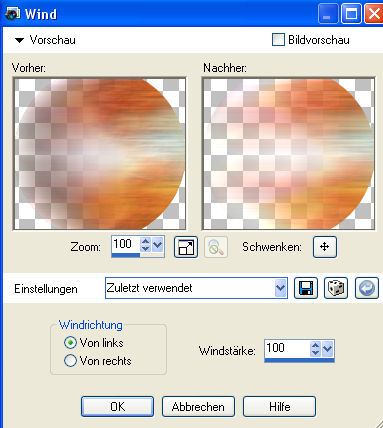 eine Auswahl um Deinen Planeten. Dupliziere die Auswahl. 10. Bleibe auf der duplizierten Ebene und gehe auf Effekte - Verzerrungseffekte - Wind mit diesen Einstellungen: