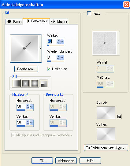 Dieses Tutorial habe ich selbst entworfen und es unterliegt meinem Copyright. Das Material stammt aus Tauschgruppen und das Copyright liegt beim jeweiligen Künstler. Ich habe das Tutorial mit Paint Shop Pro X2 geschrieben, es lässt sich aber problemlos mit allen anderen PSP-Versionen nachbasteln. Du benötigst: Paint Shop Pro Tuben: 1 Hintergrundbild 1 Blumentube 1 Frauentube 1 Lippentube Mein Material kannst Du Dir hier herunterladen. Filter: Two Moon - RotoBlades Hast Du alles zusammen? Dann lass uns beginnen! 1. Öffne Dir ein neues transparentes Arbeitsblatt in 650 x 550 Pixeln Größe. 2. Suche Dir aus Deinen Tuben eine sehr helle Vordergrundfarbe (meine ist #f9f9f9) und eine nur wenig dunklere Hintergrundfarbe (meine ist #c5c5c5). Fülle Dein Blatt mit Deiner Vordergrundfarbe. 3. Lege Dir eine neue Rasterebene an und gehe auf Auswahl - Alles auswählen. Kopiere das Hintergrundbild "JHanna-40 bground.jpg" oder Dein eigenes Hintergrundbild und füge es in eine Auswahl ein. Hebe die Auswahl auf und setze die Deckfähigkeit der Ebene im Ebenenmanager auf 50% herunter. 4. Kopiere das Tube " GraphicsByLiz_beyaz_InWhite_May2008.PspTube" oder Deine eigene Blumentube und füge sie auf Deinem Bild als neue Ebene ein. Fasse alle Ebenen sichtbar zusammen. 5. Erstelle Dir aus Deiner Vorder- und Hintergrundfarbe einen schönen Farbverlauf. Ich habe diesen gewählt: