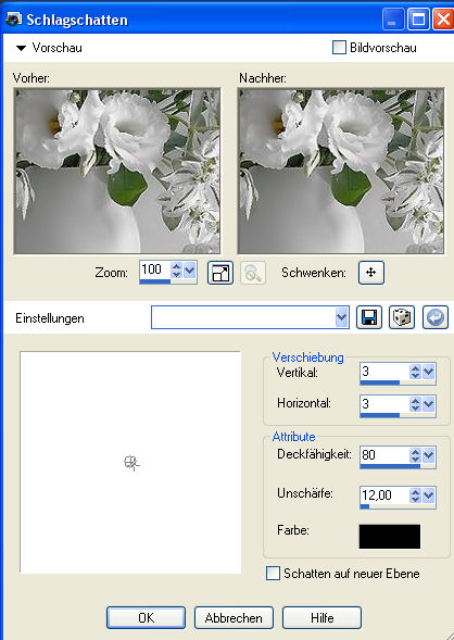 Effekte - Kanteneffekte - Nachzeichnen. 8. Aktiviere Deine obere Ebene (also die zusammengefasste) und wende dort diesen Schlagschatten an: