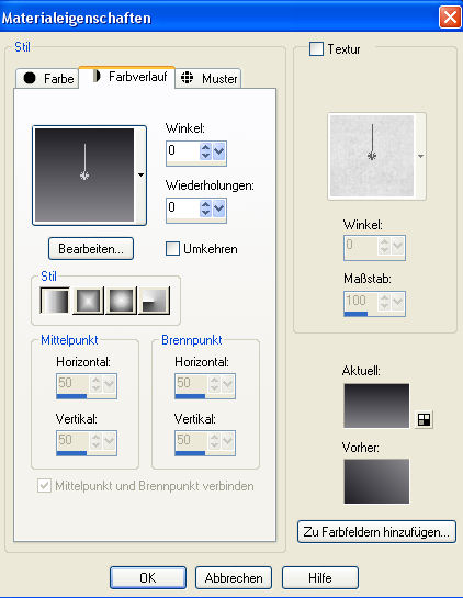 Dieses Tutorial habe ich selbst entworfen und es unterliegt meinem Copyright. Das Material stammt aus Tauschgruppen und das Copyright liegt beim jeweiligen Künstler. Ich habe das Tutorial mit Paint Shop Pro X2 geschrieben, es läßt sich aber mit allen anderen PSP-Versionen problemlos nachbasteln. Du benötigst: Paint Shop Pro Tuben: 1 Landschaftstube 1 Treppen- oder Brückentube 1 Gesichtstube 1 Frauentube 1 Blumentube evtl. einen Brush oder eine Dekotube Mein Material kannst Du Dir hier herunterladen. Filter: Graphics Plus - Cross Shadow Xero - Improver Hast Du alles zusammen? Dann lass uns beginnen! 1. Öffne Dir ein neues transparentes Arbeitsblatt in 700 x 600 Pixeln Größe. 2. Suche Dir aus Deinen Tuben eine hellere Vordergrundfarbe (meine ist #8a898e) und eine dunkle Hintergrundfarbe (meine ist #1f1e24). Erstelle aus diesen Farben einen Farbverlauf. Ich habe diesen gewählt: