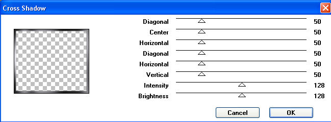 Fülle Dein Blatt mit dem Farbverlauf. 3. Lege Dir eine neue Rasterebene an und gehe auf Auswahl - Alles auswählen. Kopiere das Tube " GothScenery2.pspimage" oder Dein eigenes Landschaftstube und füge es auf Deinem Blatt in eine Auswahl ein. Hebe die Auswahl auf. 4. Kopiere das Tube " DIV-MAI2008-02.pspimage" oder Dein eigenes Treppen- oder Brückentube und füge es als neue Ebene auf Deinem Blatt ein. Setze den Mischmodus im Ebenenmanager auf "Helligkeit (L)". Verschiebe sie an eine passende Stelle auf Deinem Bild. 5. Kopiere das Tube "SS_1439_Misted.psp" oder Deine eigene Gesichtstube und füge sie als neue Ebene auf Deinem Bild ein. Passe sie größenmäßig an (Größe aller Ebenen anpassen nicht angehakt) und verschiebe sie ganz nach oben auf Deine Treppe. Ich habe meine Tube auf 40% verkleinert. Setze die Deckfähigkeit im Ebenenmanager auf 40% herunter. 6. Kopiere das Tube " jet-B&W-woman-juli-2007.pspimage" oder Deine eigene Frauentube und füge sie als neue Ebene auf Deinem Bild ein. Passe sie größenmäßig an (Größe aller Ebenen anpassen nicht angehakt) und verschiebe sie an den Fuss der Treppe oder Brücke. 7. Kopiere das Tube "SKF_Rose284.08.pspimage" oder Deine eigene Blumentube und füge sie als neue Ebene auf Deinem Bild ein. Passe sie größenmäßig an (Größe aller Ebenen anpassen nicht angehakt). Ich habe meine auf 70% verkleinert. Verschiebe sie an eine passende Stelle auf Deinem Bild. Wenn Deine Blumentube nicht farblich passend ist, dann spiele ein wenig mit dem Mischmodus im Ebenenmanager. 8. Fasse alle Ebenen sichtbar zusammen. Bild - Rand hinzufügen - symmetrisch 10 Pixel in einer Farbe die nicht auf Deinem Bild vorkommt. 9. Markierde diesen Rand mit Deinem Zauberstab und lege eine neue Rasterebene an. Fülle die Auswahl mit Deiner Vordergrundfarbe. 10. Wende den Filter Graphics Plus - Cross Shadow mit folgenden Einstellungen an: