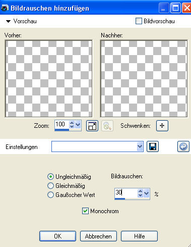 Hebe die Auswahl auf. 11. Fasse alle Ebenen sichtbar zusammen. Bild - Rand hinzufügen - symmetrisch 5 Pixel in einer Farbe, die nicht auf Deinem Bild vorkommt. 12. Markiere diesen Rand mit dem Zauberstab und lege eine neue Rasterebene an. Fülle die Auswahl mit Deiner Hintergrundfarbe. 13. Anpassen - Bildrauschen hinzufügen/entfernen - Bildrauschen hinzufügen mit diesen Werten: