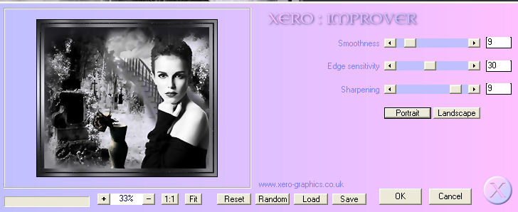 Hebe die Auswahl auf. 15. Bild - Rand hinzufügen - 10 Pixel symmetrisch in einer Farbe die nicht auf Deinem Bild vorkommt. Markiere diesen Rand mit dem Zauberstab und lege eine neue Rasterebene an. Fülle die Auswahl mit Deiner Vordergrundfarbe. 16. Wende den Filter Graphics Plus - Cross Shadow mit den Standardeinstellungen an (übernimm alle Werte wie voreingestellt). Hebe die Auswahl auf. 17. Fasse alle Ebenen zusammen und wende den Filter Xero - Improver - Portrait mit diesen Einstellungen an: