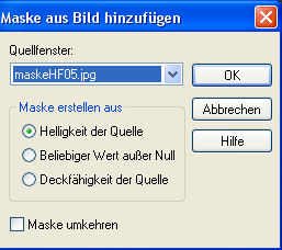 1. Öffne Dir ein neues transparentes Arbeitsblatt in 500 x 400 Pixeln. 2. Suche Dir aus Deinen Tuben eine helle Vordergrundfarbe (meine ist #D0C0B2) und eine dunklere Hintergrundfarbe (meine ist #F42F31) und fülle Dein Blatt mit der Hintergrundfarbe. 3. Ebenen - Neue Rasterebene und fülle diese mit der Vordergrundfarbe. 4. Öffne nun die Maske "maskeHF05.jpg" und minimiere sie. Gehe auf Ebenen - Neue Maskenebene - Aus Bild und lade die Maske mit diesen Einstellungen: