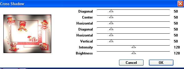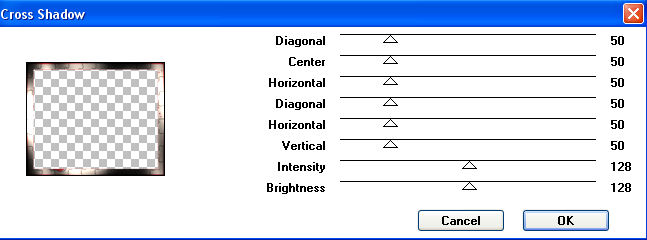 19. Markiere den transparenten Rand mit dem Zauberstab. Ebenen - Neue Rasterebene und füge Dein Bild (was Du noch in der Zwischenablage hast) in eine Auswahl ein. Lasse die Auswahl bestehen und wende den Filter Graphics Plus - Cross Shadow nochmal mit diesen Einstellungen an:
