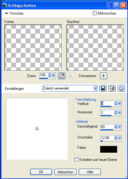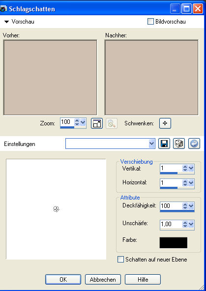 und den gleichen Schlagschatten nocheinmal mit -3 bei Vertikal und Horizontal. Nun hebst Du die Auswahl auf. 21. Beschrifte Dein Tag nun noch wenn Du magst und setze Deinen Namen oder Dein Wasserzeichen auf Dein Bild. 22. Fasse alle Ebenen zusammen und speicher es als jpg-Datei ab.
