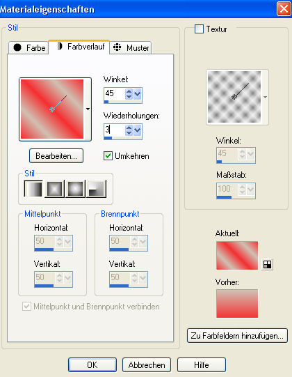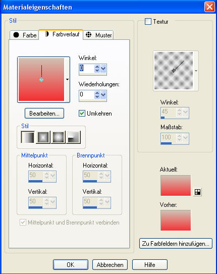 und lege eine neue Rasterebene an. 7. Öffne nun das Tube "14[1].pspimage", spiegele einmal Vertikal und kopiere es. Füge es auf Deinem Arbeitsblatt in eine Auswahl ein. Auswahl aufheben und wieder den Schlagschatten aus Punkt 5 anwenden. 8. Gehe zurück auf Deine Maskenebene und klicke mit dem Zauberstab mit den gleichen Einstellungen in das linke Kästchen Deiner Maskenebene. Ebenen - Neue Rasterebene. 9. Öffne das Tube "9[1].pspimage", spiegele es Vertikal und kopiere es. Füge es auf Deinem Arbeitsblatt in eine Auswahl ein. Hebe die Auswahl auf und wende wieder den Schlagschatten an aus Punkt 5, jedoch hier mit -1 bei Vertikal und Horizontal. 10. Gehe nun auf die oberste Ebene und kopiere Dir Deine anderen Zwerge oder Tuben. Füge sie als neue Ebenen auf Deinem Bild ein und verteile sie so, wie es Dir gefällt. Gebe auch hier wieder bei jeder Tube den Schlagschatten dazu.... ob mit Minus- oder Pluswerten oder beiden nacheinander probierst Du Dir bitte selbst aus, denn es ist abhängig davon, wie Du die Tuben anordnest. 11. Erstelle Dir nun aus Deiner Vorder- und Hintergrundfarbe folgenden Farbverlauf:
